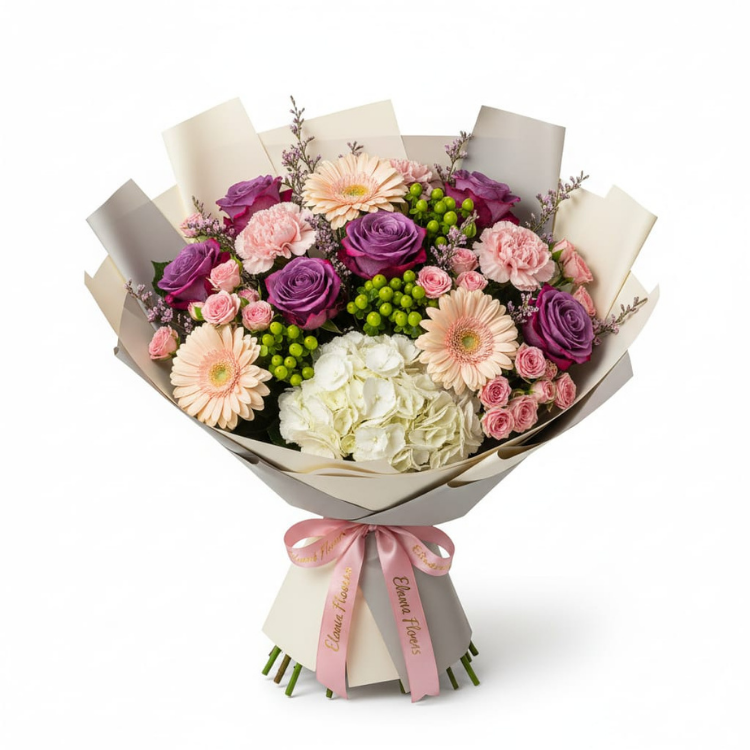 Express your self with subtle beauty of Elandra with Lavender Bliss. Our bouquet combines the tenderness of pink and warmth of peach gerbera crating harmonious and graceful dispay of Care and fragrance.