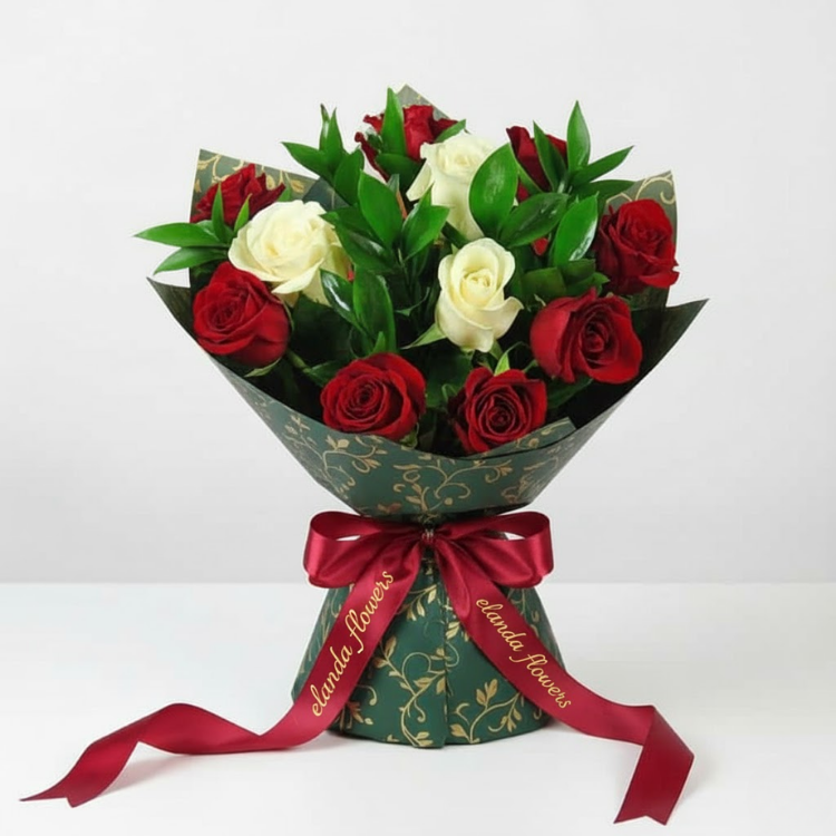 The “One Wrap” bouquet is a classic and elegant arrangement, perfect for any special occasion. It features a stunning mix of fresh red and white roses, carefully hand-tied with lush greenery for a vibrant and sophisticated look. The bouquet is presented in a stylish dark green wrap with a decorative pattern, and finished with a bold red ribbon prominently displaying the Elandra Flowers brand. This arrangement is ideal for celebrating anniversaries, birthdays, or Valentine’s Day