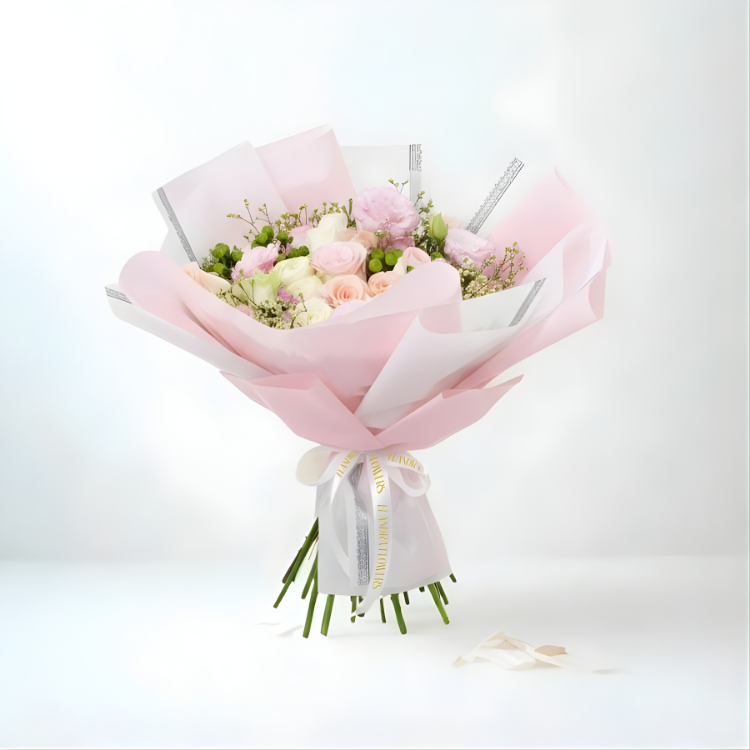 This arrangement features a combination of white roses, pink marshals, and pink-dyed carnations, expertly arranged with delicate baby blue eucalyptus to create a soft and romantic aesthetic. Whether you’re celebrating a special occasion or simply looking to surprise someone special, this beautiful bouquet is sure to make their day.