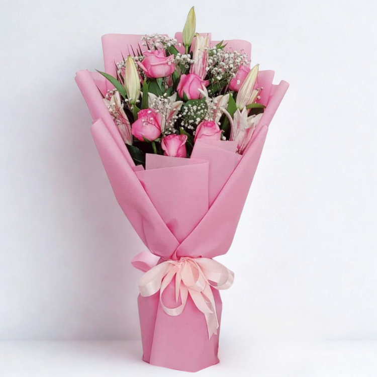 A stunning fusion of 6 radiant roses and 6 elegant lily stems, this bouquet captures the perfect balance of beauty and grace. Wrapped in charming pink paper, it radiates tenderness and sophistication. Accented with lush fillers, this arrangement showcases nature’s finest artistry. Whether it’s a gesture of love, admiration, or gratitude, this Roses and Lilies Pink Bouquet is a true floral masterpiece — a heartfelt gift that brings joy and warmth to every occasion.